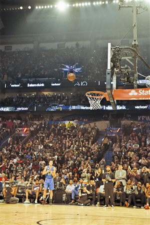还是说回无人机。事实上,如果把NBA全明星赛看成一场秀,那么无人机可以说在这里几乎完成了亮相的“帽子戏法”——戈登若是再给力些就更好了。从中国春晚的《满城烟花》,到美国“春晚”的超级碗中场秀,再到昨天的NBA扣篮大赛,无人机每一次“蹭热点”都会赚足眼球,因为每个人都知道,科技的推动不仅象征着人类的进步,更意味着人们生活品质的又一次提高,今天无人机出现在球场里,明天就可能飞至你的家门口,帮你送个快递。