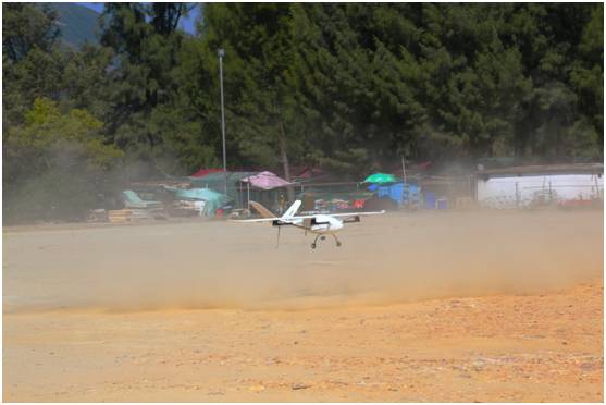 据了解,本场飞行的V330机型是深圳智航无人机有限公司投入两年时间耗资千万级的新产品。V330的最大特点是采用倾转旋翼技术,既有旋翼又有固定机翼,这种无人机能够以多旋翼模式起降,具有起降灵活、场地不受限的特点。同时能够以固定翼模式巡航飞行,飞行效率高、续航时间长、巡航速度快。该飞行器的旋翼可以从垂直位置转向水平位或者从水平位置转到垂直位置,使得多旋翼模式和固定翼模式能够共用动力系统,避免两种模式都携带大量“死重”而导致运载效率和巡航效率低的问题,无人机V330精准降落达到厘米级。