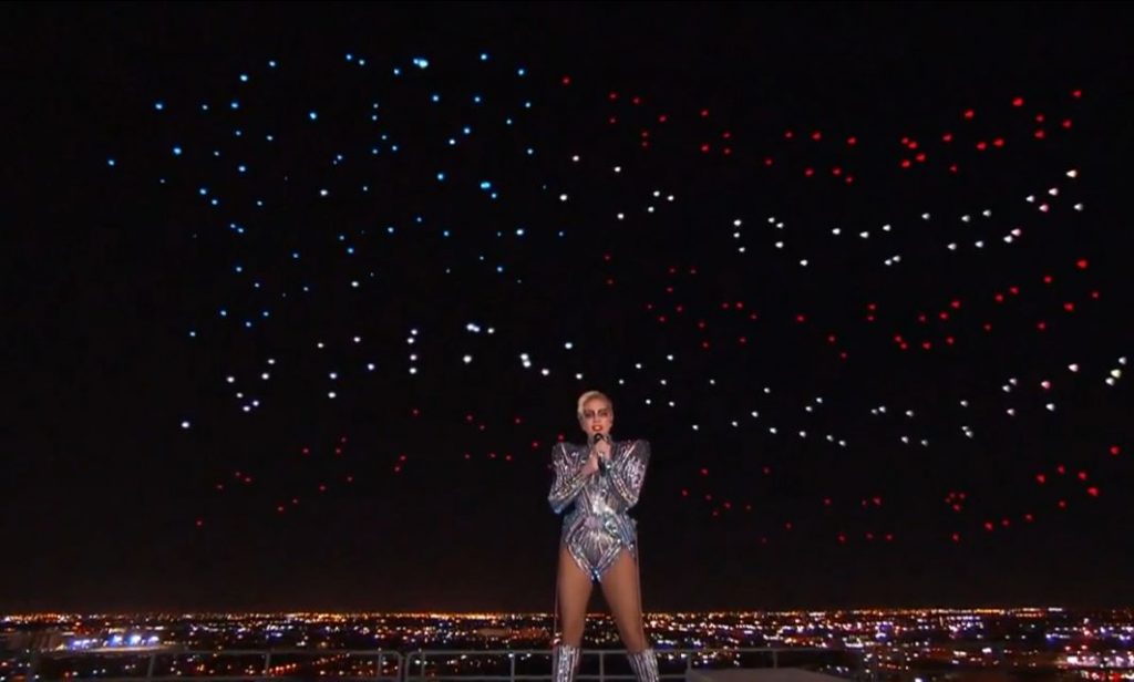 美国2017年的超级碗星期天(Super Bowl Sunday)上,Lady GaGa与Intel赞助的500架无人机共舞。
