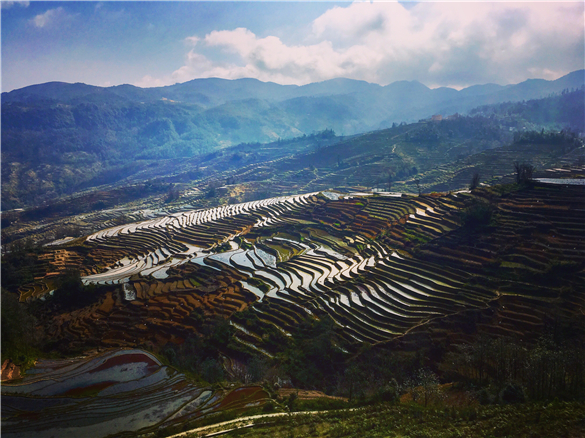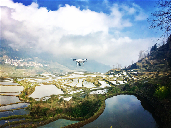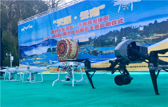 映衬着美丽的千年哈尼梯田,一架架无人机陆续起飞。2月17至20日为期四天的“天眼云南”2017首届元阳无人机摄影大赛正式开始。