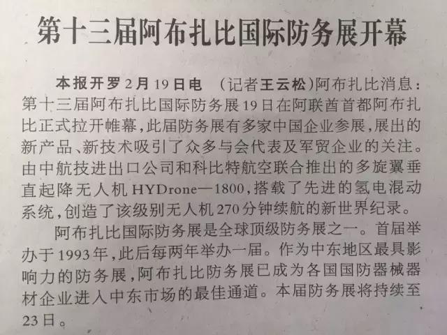 2月19日,第十三届阿布扎比国际防务展在阿联酋首都阿布扎比正式拉开帷幕,此届防务展有多家中国企业参展。中国展出的新产品、新技术吸引了众多与会代表及军贸企业的关注。由中航技进出口公司和科比特航空联合推出的多旋翼垂直起降无人机HYDrone-1800,搭载了先进的氢电混动系统,创造了该级别无人机270分钟续航的新世界纪录。