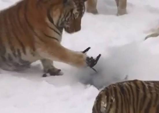 另外一个固定镜头显示,无人机被一只东北虎跳起后一掌击落,随后便冒气浓烟...看来是电池爆了。无人机在航拍时被追逐的老虎一巴掌拍下之后还被咬了几口,疑似被东北虎们当作了食物。