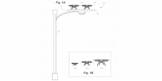 事实上,早在去年7月份,就有多张类似的无人机路灯充电专利图被媒体曝光。根据先前的报道,亚马逊无人机“接驳点”送货系统原打算在电线杆、路灯等垂直物体架设“加油停机坪”,甚至在“停机坪”下方设置快递投递柜,通过管道直接在“停机坪”将快递投入其中。