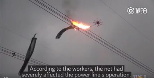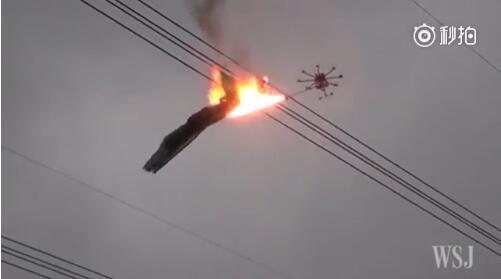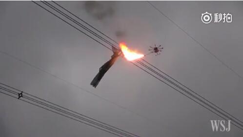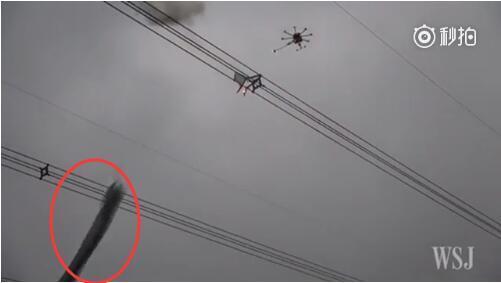 湖北襄阳一处高压电线因被网状物缠绕发生故障。电力公司的维修人员使用一架喷火的无人机清除了异物,恢复了高压电线的正常供电。