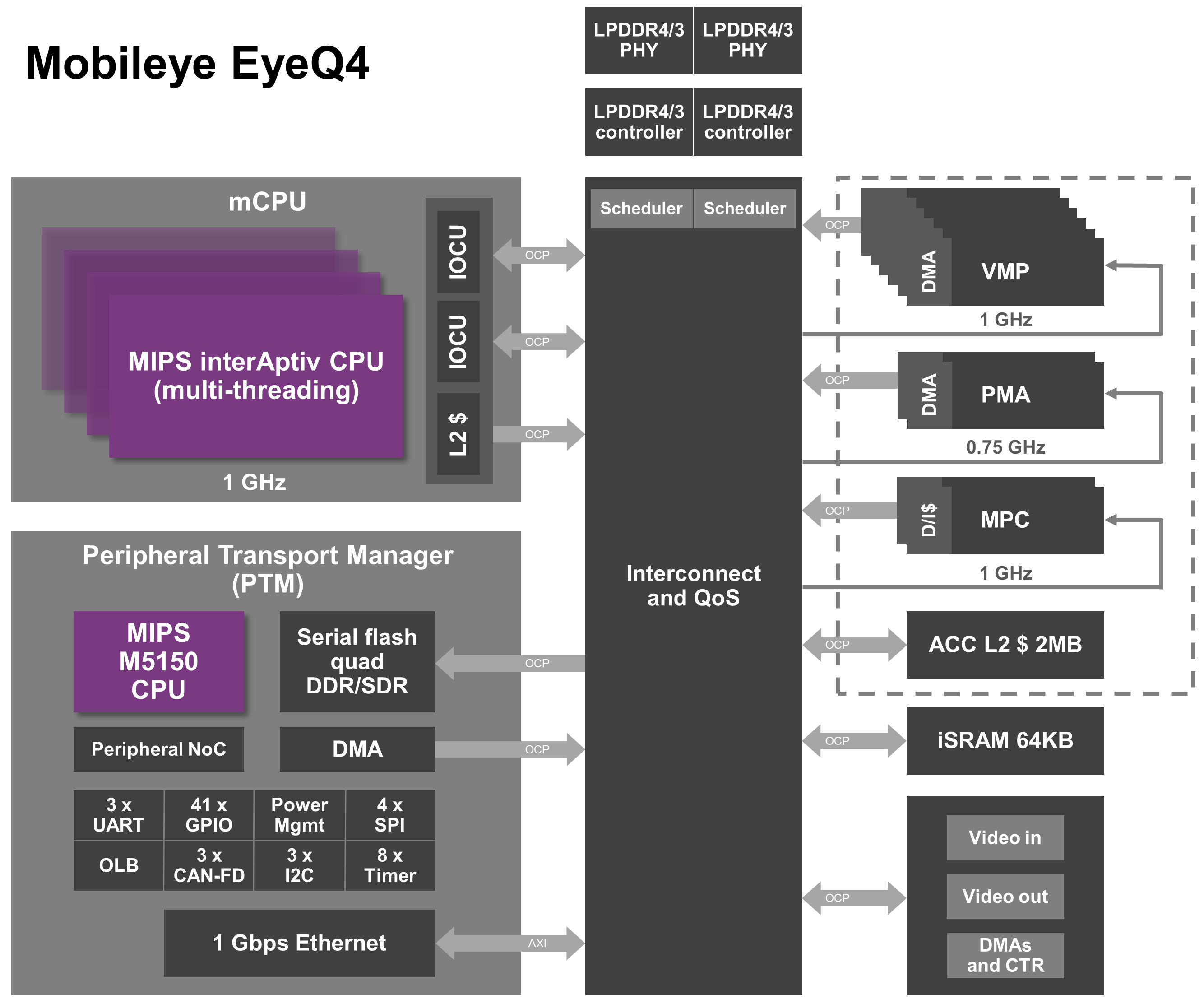 Mobileye多年专注于汽车行业的计算机视觉技术研发,其EyeQ系列芯片已经成为自动驾驶感知部分的关键器件。最近型号EyeQ 4及未来的升级版EyeQ 5系列将可以实现L3-L5级别的自动驾驶。下图是其EyeQ 4芯片的内部组成模块示意图。