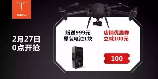 2月27日,GDU普宙无人机BYRD Premium 2.0新品首发,零点火热开抢,优惠力度空前。在首发期间,购买GDU普宙无人机BYRD Premium 2.0即赠送999元原装电池1块,并凭店铺优惠券立减100元(具体优惠规则详见淘宝官方商城)。
