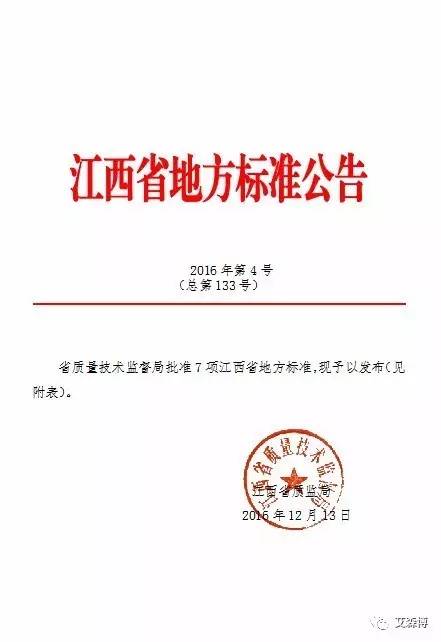 2016年12月江西省质量技术监督局颁布第4号文件《江西省地方标准公告》