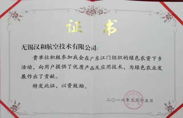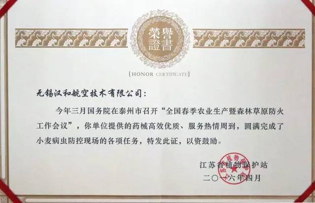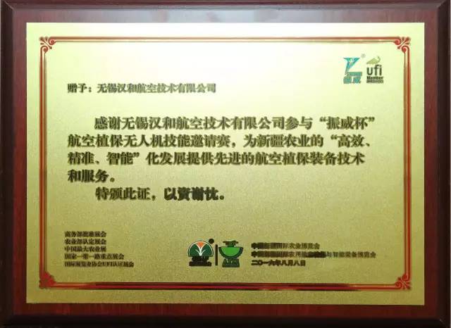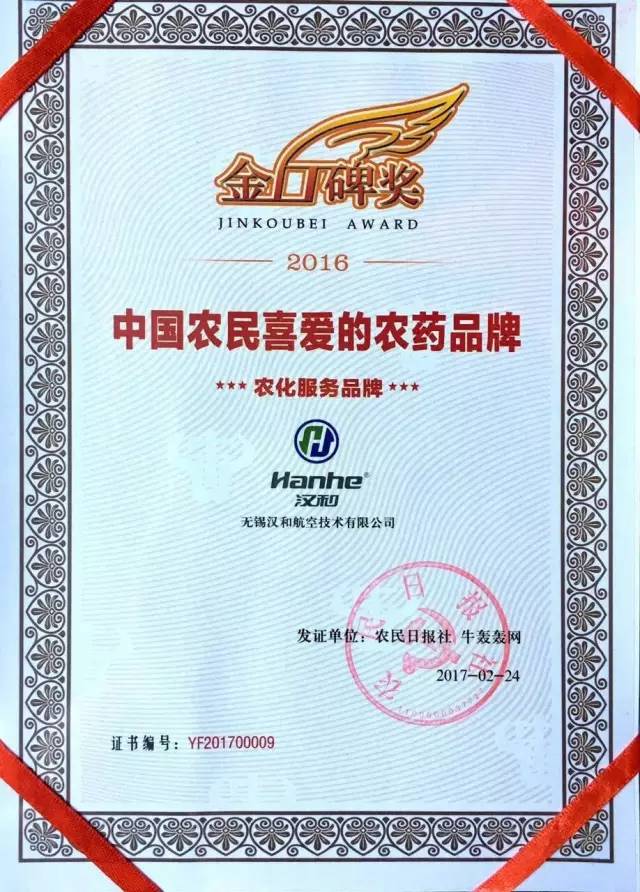 会上,无锡汉和航空技术有限公司做为唯一一家植保无人机企业获得“金口碑”奖,入选“中国农民最喜爱的农化服务品牌10强”。
