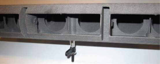 美国试金石实验室开发了一种电加热工装(EHT),一种用于OOA工艺的自加热泡沫(CFOAM) 。CFOAM产自粉末沥青煤,经由压入敞口模,在高温下处理并在热压罐中加压,泡沫板粘结在一起形成近无余量薄坯板料,加工成想要的外形。工装表面由HexTOOL材料这样的复合材料成形。EHT工装拥有不变的横截面以及工装表面之下的电阻加热泡沫加热元件。石墨电极与元件相连以提供电力,元件本身与工装剩余部分电绝缘。这样,电阻加热就只发生在工装表面之下,使其更节能,而且里面的泡沫基体由于与表面隔热,也不会被加热,减少了热损耗。工装表面使用的碳纤维比碳泡沫导电性强,如果纤维和泡沫接触,短路将造成不均匀加热,通过加热元件的电绝缘,可以实现工装表面的一致性加热。试验结果表明,无论对于平滑的还是复杂的工装外形,该工装的机械属性都与标准的热压罐固化工装相当。
