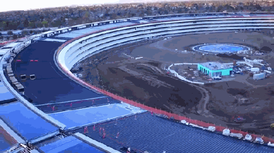 从视频中我们看到,新总部的几个主要分工区域都已经接近完工的状态,并且彼此之前已经开始进行连接。包括乔布斯纪念礼堂、地下停车场、太阳能屋顶和整个园区的植被绿化都被我们尽收眼底。同时我们还能清晰的看到正在施工的工人以及车辆的进出。