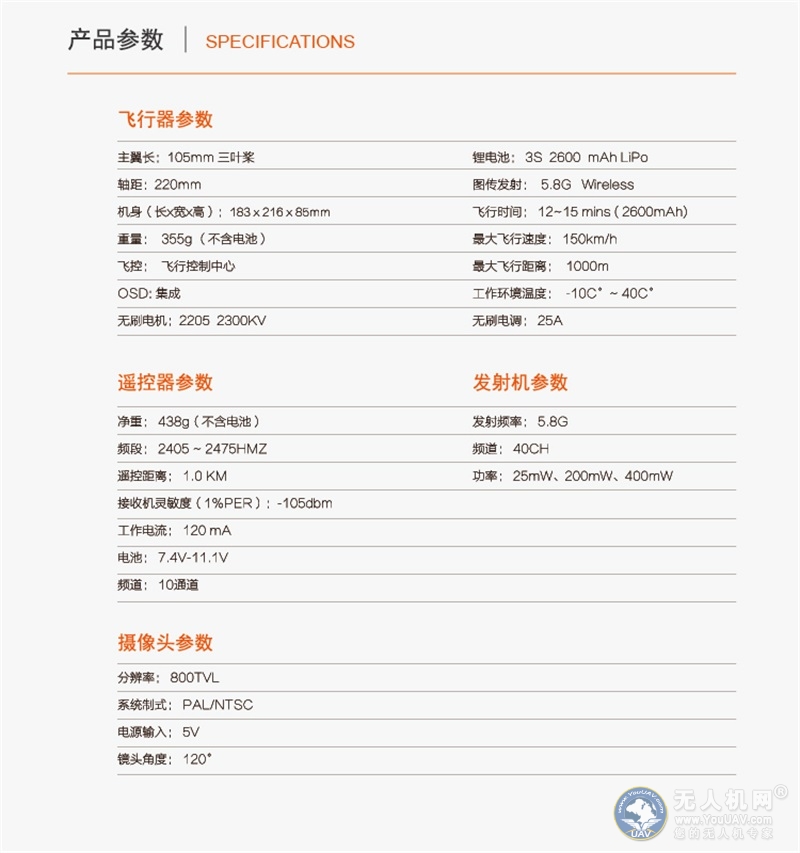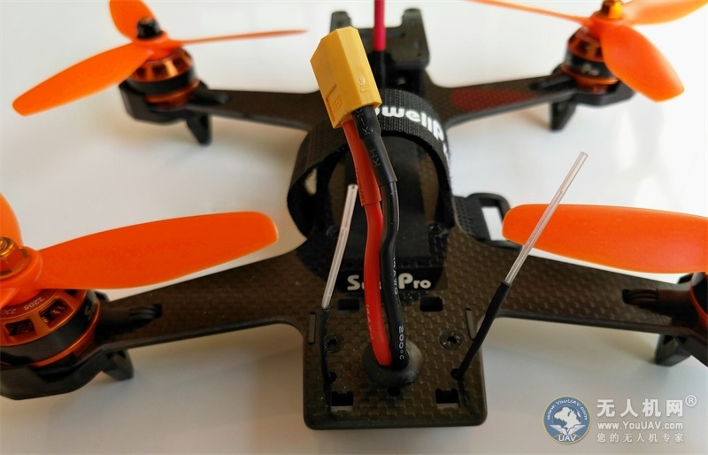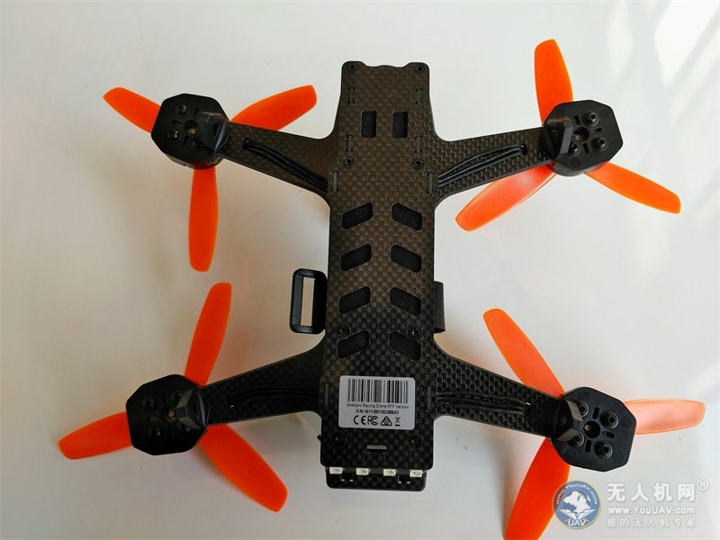 斯威普雨燕整体构造设计类似一个矩形,仅有220mm的一体式机身之中包括了飞控、电调、图传和PCB等核心配件,整个穿越机显得十分简洁而紧凑。四周是带有橘色防水涂料的四个电机与其四个橘色的3叶桨遥相呼应,中间是一条带有logo的固定带,后端是一根(红色和黑色)连接电池的线,左右两根(白色)是信号线发射线。