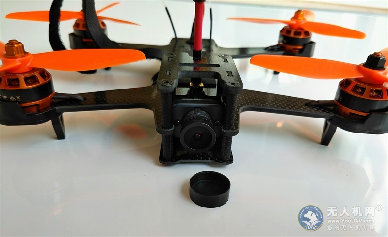 雨燕最前段是一个像素为800TVL的嵌入式摄像头,镜头角度是进行120度调节,前段有一个塑料镜头保护盖,摄像头的左右有2个碳纤维材质的小圆柱体将其护在其中,起到一个防撞击保护作用。无人机网评测师个人认为摄像头的位置设计非常人性化和安全化,从之后的实飞测试中就能凸显出来。