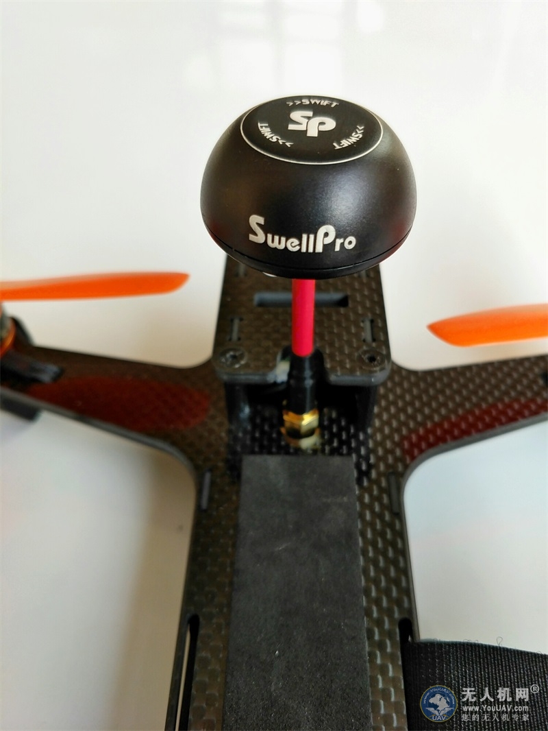 斯威普雨燕5.8G蘑菇状带有logo的天线装置,圆弧形的设计可以最大程度的减小风阻,(据官方了解其图传距离可达800m)。该天线是一个独立的装置可方便装卸和更换,经后期试飞表现来看蘑菇状的天线是很抗摔的而并非徒有其名。