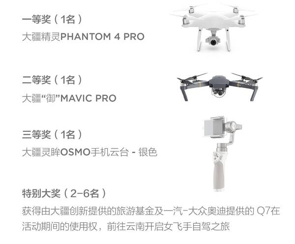 这次,除了常规大奖外,我们还特别准备了好座驾和好去处——我们将在所有参赛者里挑出2-6名幸运儿,他们将获得大疆创新提供的旅游基金,以及一汽-大众奥迪提供的Q7在活动期间的使用权,前往云南开启女飞手自驾之旅。