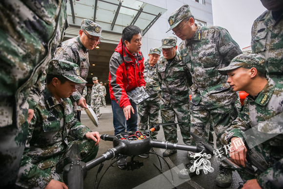“在抢险救援的时候,往往会有不少塌方或者洪水等不方便前往的地方,这时无人机便有了大用场。”操作无人机的工作人员告诉记者,这种无人机平时可以用于观测水稻等粮食的收割情况,在防汛救灾方面不仅可以勘察危险地形,还能负重十多斤,迅速投送药物、食物、水等应急救灾物资。“这种新型的无人机,充一次电可以飞行一个小时,飞行距离可以达到十多公里,无人机采用碳纤维材料制造,相比起以往的无人机机身重量更轻,飞行更远,负重重量也更多。”