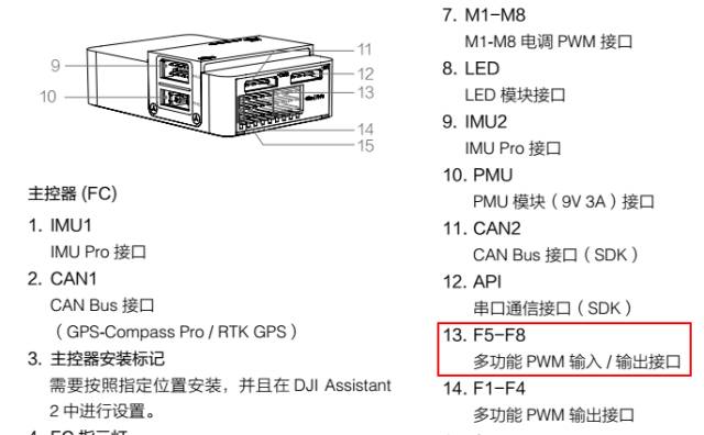 经纬M600内置标准的A3飞控,A3飞控带有4个PWM输出口,4个PWM输出/输入口,暂时相当于8个PWM输出通道,其中F1通道连接风扇,F2通道连接起落架,剩余6个可扩展通道(F3~F8)。