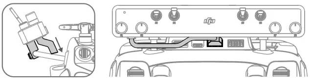 ①首先将水平卡扣卡在遥控器提手上,然后向上用力使竖直卡扣卡在遥控器提手上。