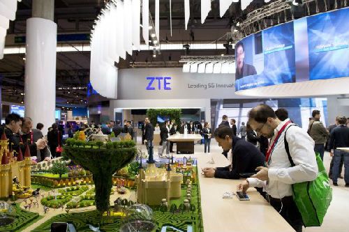 2月27日,在西班牙巴塞罗那举行的世界移动通信大会上,人们在中国品牌中兴的展台参观。