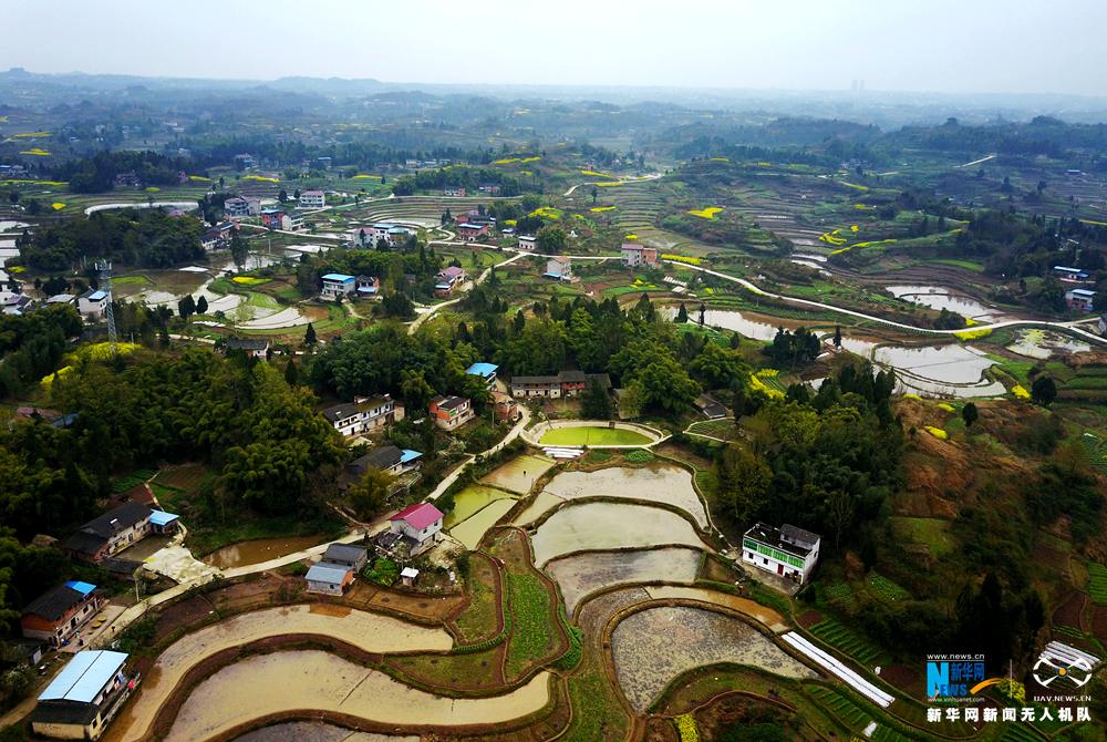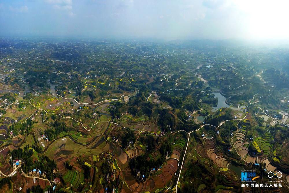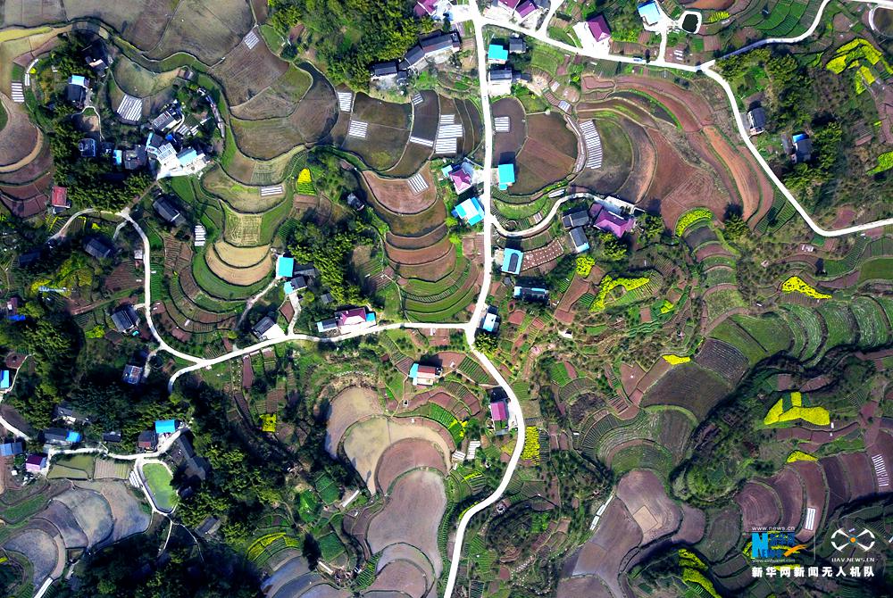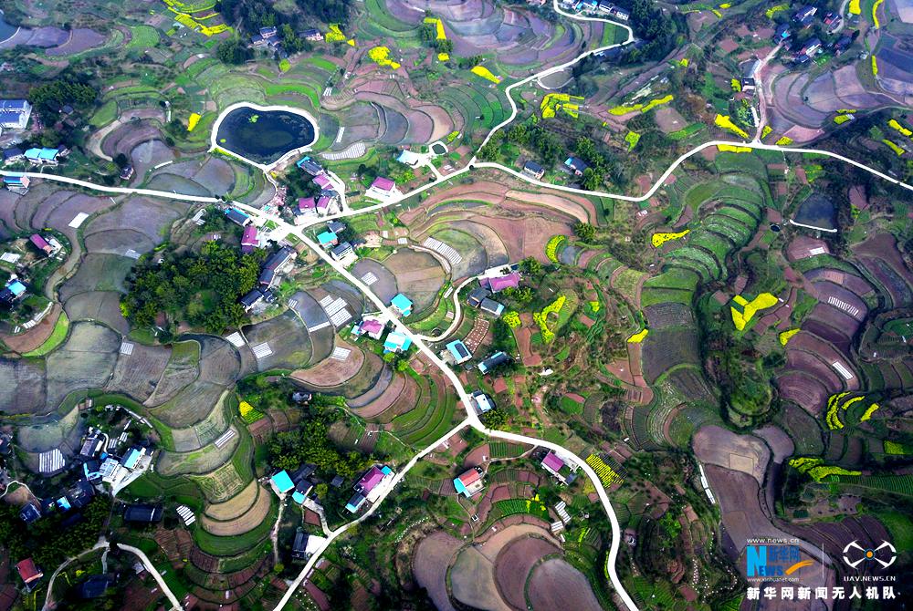 2017年政府工作报告指出,要加强农村公共设施建设,新建改建农村公路20万公里,实现农村稳定可靠供电服务和平原地区机井通电全覆盖,完成3万个行政村通光纤,提高农村饮水安全供水保证率,加大农村危房改造力度,深入推进农村人居环境整治,建设既有现代文明、又具田园风光的美丽乡村。重庆市忠县花桥镇天井村便是修路致富的典型例子,从几年前的泥泞路,到如今四通八达的水泥公路,天井村已经从贫困落后的老旧村落,转身为具有田园风光的美丽乡村。图为航拍重庆忠县天井村全貌,白色的水泥公路四通八达。
