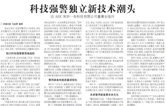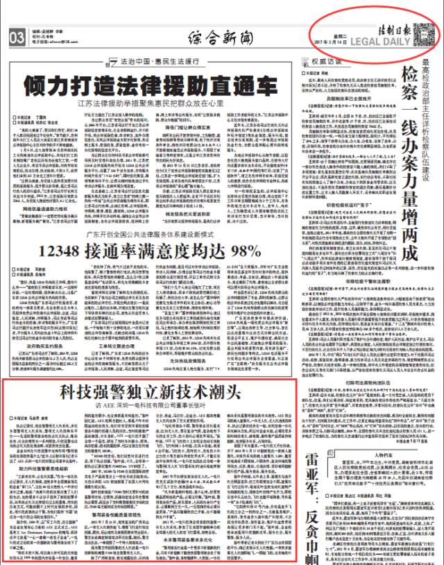 3月14日,法制日报综合新闻发行,报道AEE深圳一电科技有限公司董事长张叶及其为科技强警的伟大贡献。