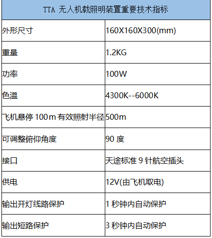 天途无人机载照明装置适用于边界巡逻、刑事追捕、监狱看守,工矿、别墅、庄园、养殖场看护、轮船海上照明,具有良好的防水、防尘、抗振动功能;具有输出超压、电压不足保护功能;具有良好的防电磁辐射干扰功能,配合天途项目机标配摄像传输模块可实现夜间实时图像传输。
