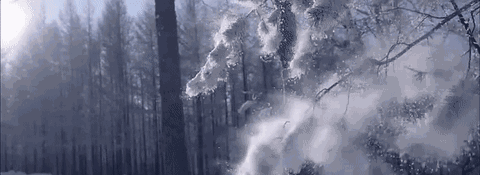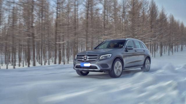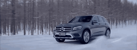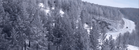 如上图所示,在航拍构图方面,摄制组选择把被拍摄物体放在画面右侧角落的做法,这样有效地向观众交代了冰雪覆盖的森林这一大环境。随着时间的推进,镜头慢慢向汽车推进,进一步交代整体环境与汽车的关系,将观众的注意力从森林与大片的雪景引向所摄汽车。