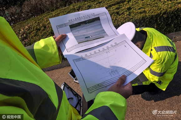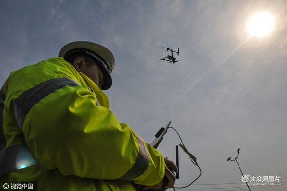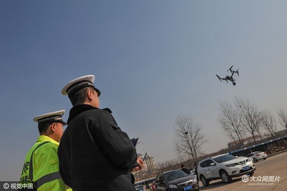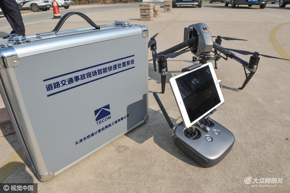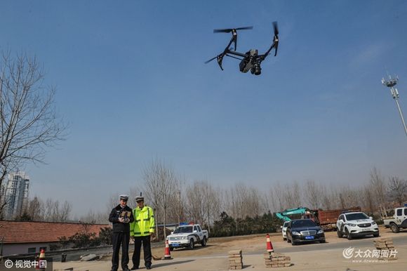 2017年03月17日,山东省日照市, 日照市山海天交警大队新装备的道路交通事故现场智能勘察系统正式投入运行。无人机勘察事故十几分钟就能完成。