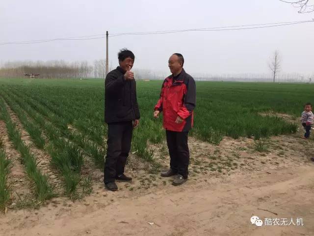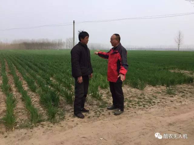 酷农公司赵总和贫困户共同交流小麦防治效果,贫困户看后竖起大拇指赞同,好!好!真快,感谢酷农公司,赵总说这是我们酷农公司应该做的,不能忘了革命老区贫困户。