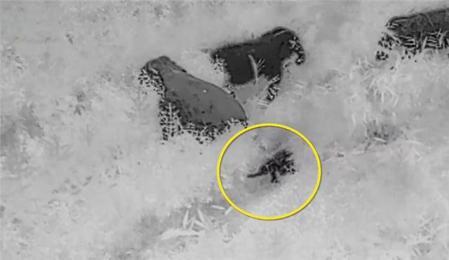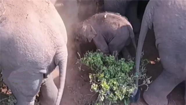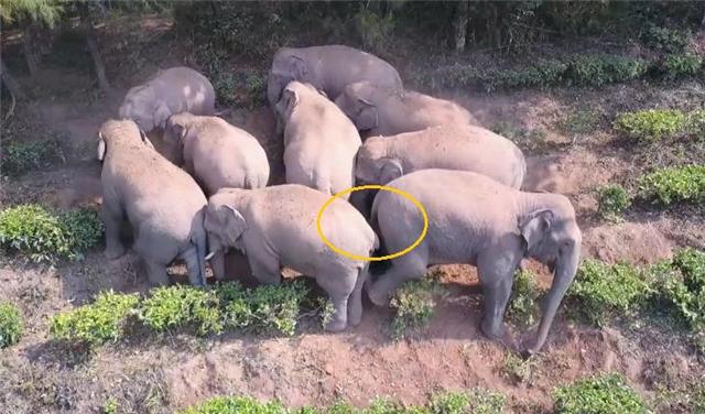 由于无人机无法靠近,不能够清晰的看到象宝宝的情况,似乎真有些不大好。但显然,在家长的保护下,象宝宝并不惊慌,而是慢慢的在活动。