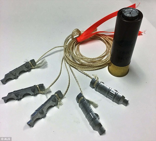 该霰弹通过12号口径霰弹枪发射,发射后该霰弹会立即分成五块,五块之间通过细线连接形成一张直径约为五尺的大网。被击中的无人机将受网绳之困而失控并坠落。
