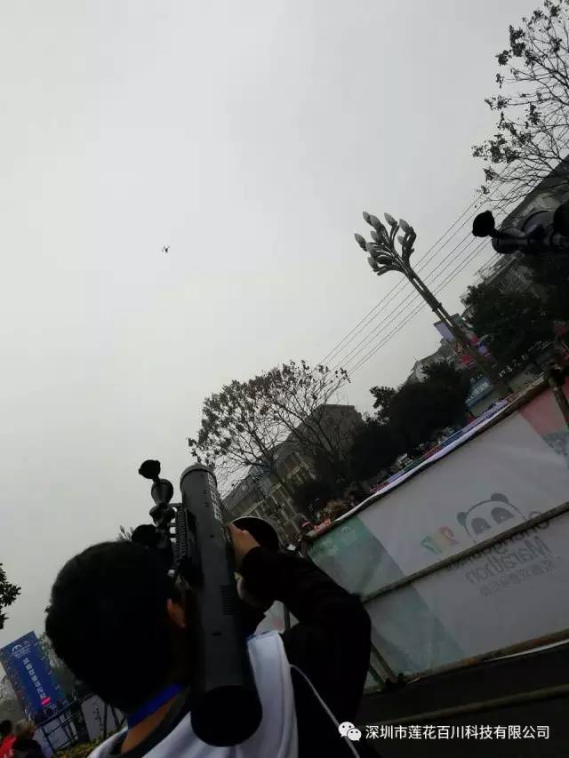 当日我司与当地相关政府沟通之后,我司严劲松总经理、景小平博士带领工作人员前往都江宴凤凰体育场,运用便携式反无人机设备莲花盾LHD-1及车载式反无人机设备莲花盾LHD-2,有效干扰、阻挡无人机靠近,在警戒范围内有效攻击,诱导迫降无人机,保障低空飞行安全以及跑友安全服务工作。至马拉松比赛结束,我司工作人员使用反无人机系统共驱离无人机数量11架。