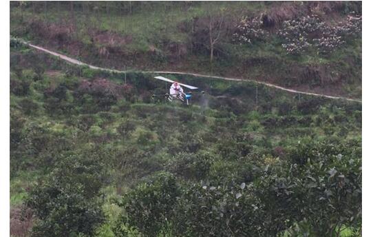 重庆天鹰兄弟植保队的地勤人员介绍,单旋翼植保无人机的风场大,推动农药雾滴对作物从上到下进行穿透,能够满足果树、高杆作物和较茂密作物的作业需求,提高了防治效果,还不受制于地形环境、作物高度、人工作业困难等因素。