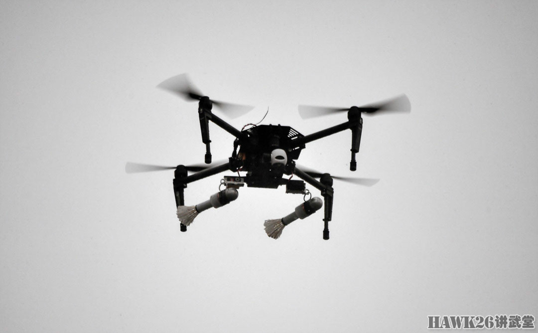 “MATRICE 100”起飞,挂载两枚羽毛球尾巴的袖珍炸弹飞向敌方控制区。
