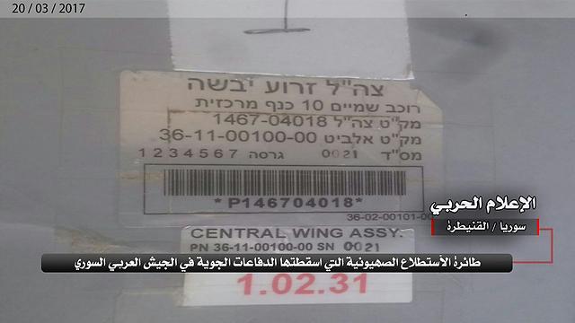 以色列国防军(IDF)证实无人机坠毁在叙利亚领土,而真主党声称无人机是被叙利亚军队击落,照片中无人机上的希伯来语ID显示无人机属于以色列国防军。