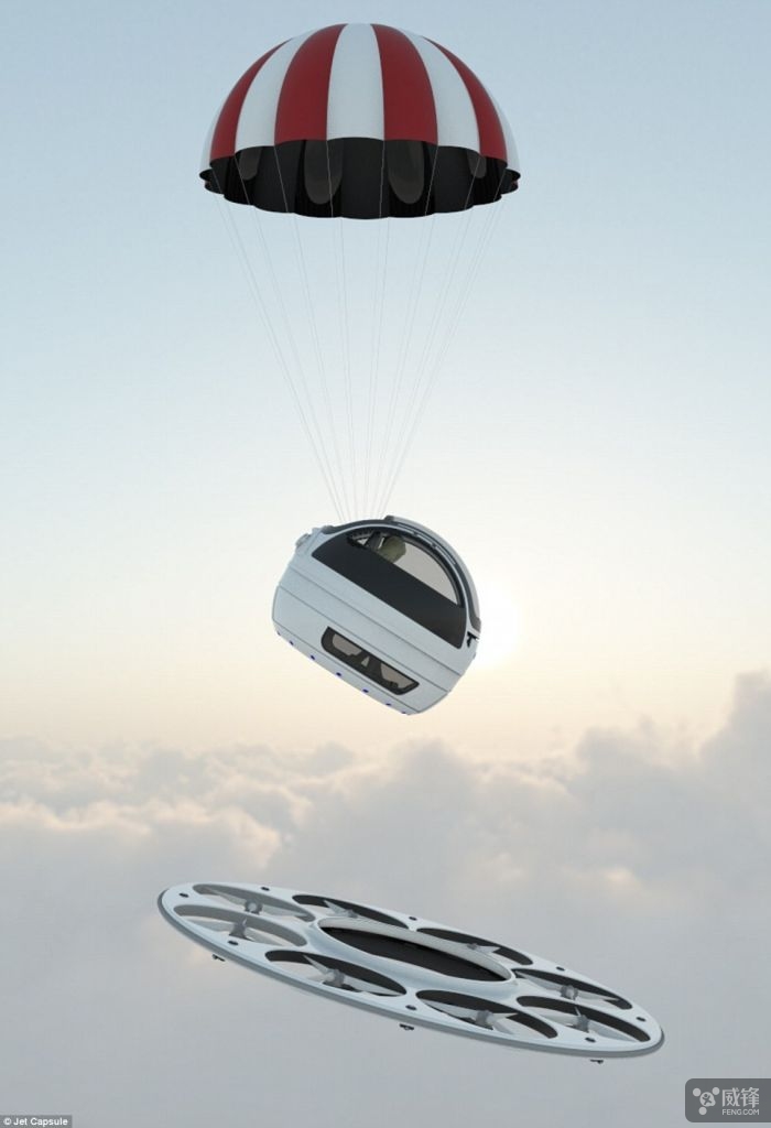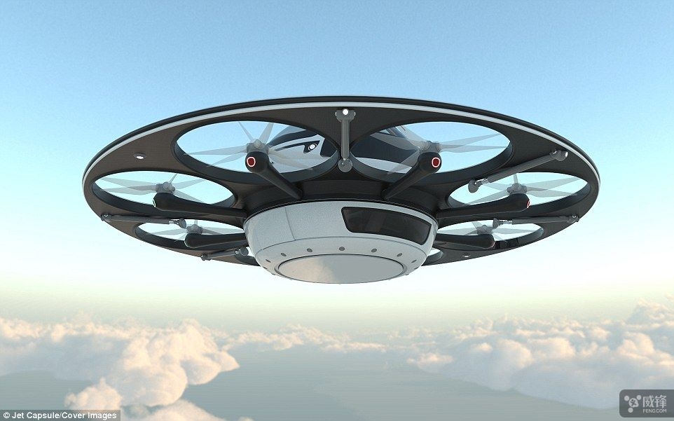 无人机高 3 米,座舱的直径为 2 米,无人机外盘带有动力强劲的 8 个转子引擎保护座舱不会从空中坠落。当紧急情况出现时,外盘可以与座舱进行剥离,座舱带有的降落伞可以保护座舱平稳降落地面。