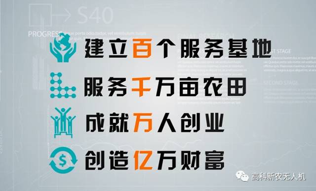 高科新农在全产业链服务体系基础上,创新提出“三个基地、一个中心”的公司发展战略,即培训基地、技术保障基地、应用示范基地和农业服务中心。六年多的应用摸索,公司创建了多种农用无人机应用模式,如育种基地的课题攻关模式、龙游的购、租、服务一体化合作模式、诸暨的农企共建模式、学员创业模式、飞手派遣模式等。基于此,公司提出了品牌战略发展的“百千万亿计划”——通过建立百个服务基地,服务千万亩农田,让更多人加入植保飞防团队,形成植保服务创业联盟,成就万人创业,创造亿万财富!