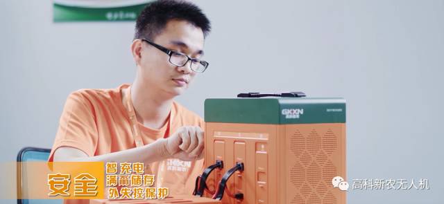 高科新农无人机采用的智能电池,可一键读取电量、支持多块连充(可一次充电12块电池),一系列智能化设计提升电池安全性和使用寿命,大大降低了此前烦琐的人工管理充电的工作强度,更简单、轻松、实用。