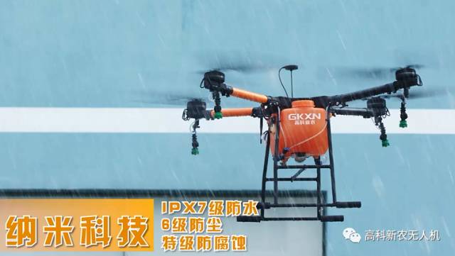 农田作业,难免风雨,真正的农用无人机绝对不是一个娇贵脆弱的奢侈品和工艺品!高科新农率先将纳米技术应用于植保无人机,产品达到IPX7防水等级,能承受水泼水浸考验,实际作业中无惧多种不利气象环境,堪称全天候无人机。能完全满足在雨中作业的需求,一个重要运用场景就是雨中施肥,让肥效充分发挥。