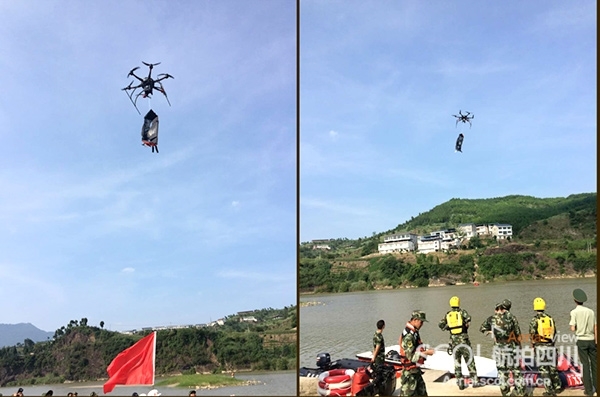 广元消防抗洪救灾演练中,无人机向被困群众抛投救生设备。