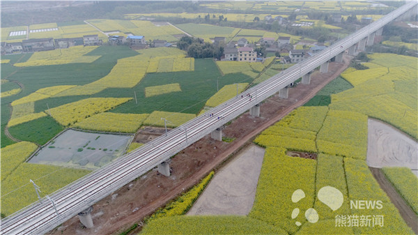 西成客专穿过的江油市境内多为油菜花田,高铁架设在菜田上,每逢春季油菜花开都会形成一道独特的自然与现代相结合的风景画卷。
