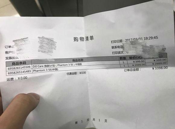购物清单,可以看到3SE的售价为2999元,为了保险起见,还购买了DJI Care换新服务。