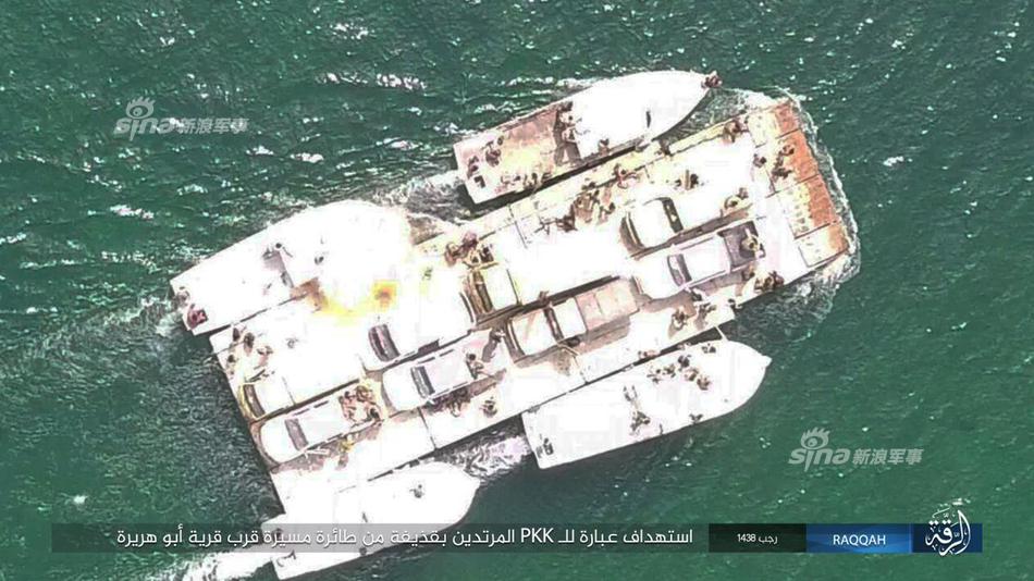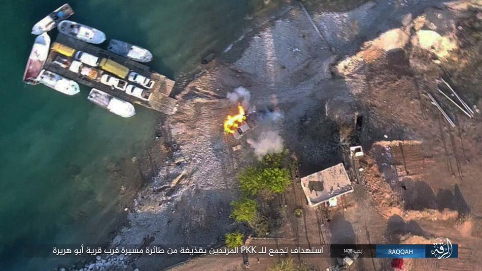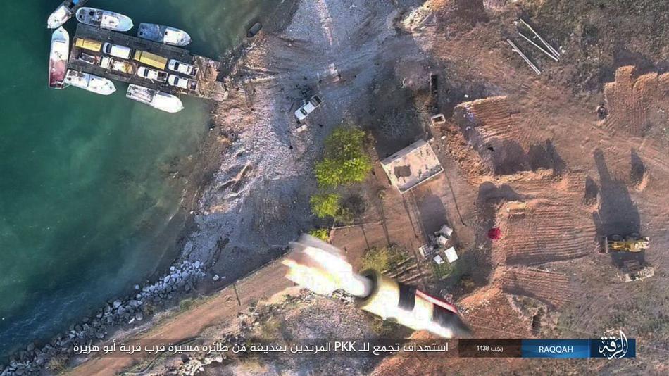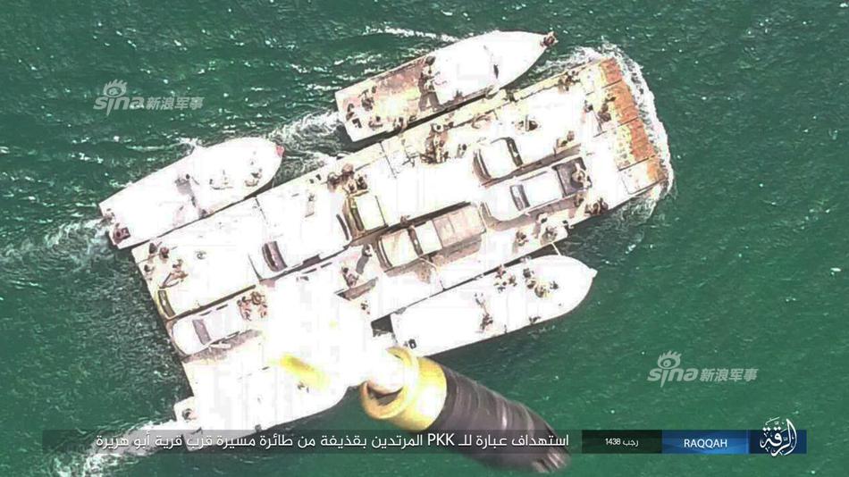 轰炸幼发拉底河口岸,渡河中的库尔德YPG人民保卫军。YPG在革命城机场打下一架IS大疆精灵无人轰炸机。同时伊拉克军大疆无人机操作技术日益熟练,开始全天候轰炸爱死。羽毛球尾翼用上了夜战!