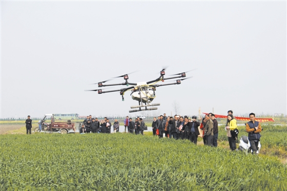 4月1日,技术员在贵池区秋江街道一处田间地头操作农用无人机为麦田喷施农药。当日,该区按照“农民点菜、按需培训”模式,组织了50名种粮大户、专业合作社负责人参加2017年新型职业农民培训——农用无人机操作员培训班。