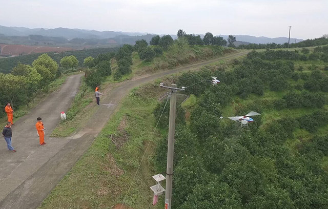 永兴县的冰糖橙种植在山上,地势陡峭,果农承包的果园,小的有 100 亩,大的有几千亩。缺水的山坡,靠人工打药,一人一天最多能打5、6亩,2000亩的果园请二十多个人来打药,也得半个月才能打完,而随着农村的空心化,在本村已经很难请到这么人打药了。