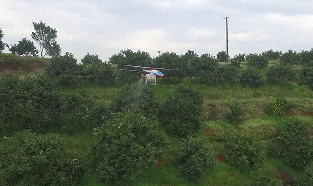 有了目标后,黄运东开始去各地考察用无人机打药可不可行。他咨询了很多用无人机打药的植保队,还走访了很多无人机厂商,有多旋翼的、单旋翼的,经过深入的考察,了解多旋翼打水稻等低矮农作物可行,打果树要用单旋翼药雾才能穿透下去。单旋翼是纯净向下压的,能有效的把药打到作物的上层、中层、下层,叶子的正面和背面,从而保证药效,他觉得单旋翼无人机更适合打冰糖橙。经过2个多月的考察,最终黄运东向天鹰兄弟购买了单旋翼的植保无人机,在家乡永兴县组建了12个人、4架飞机的飞防队。