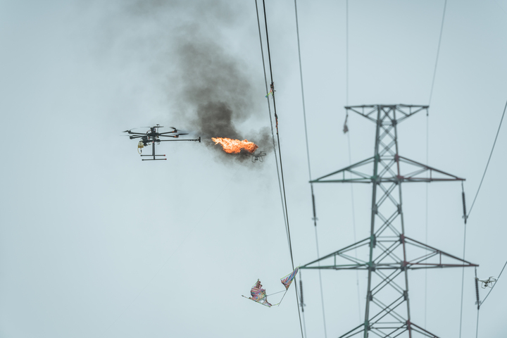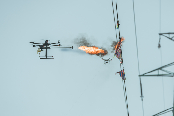 今年初,温州供电公司研制出无人机喷火装置。在一架六旋翼无人机底部加装一套喷火装置和一条长长的喷火管。每次只需加满汽油,就可喷射作业10多分钟。无人机升至空中,定点悬停后,启动喷火装置,风筝很快就被烧毁了。