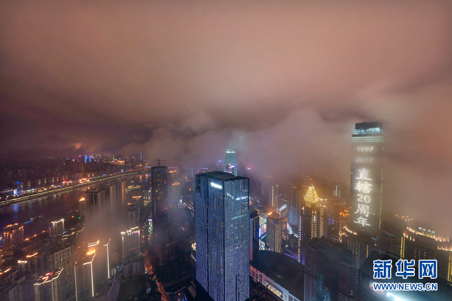 2017年是重庆市直辖20周年,位于重庆母城渝中区的解放碑商圈点亮大屏幕,显示出“直辖20周年”几个大字。