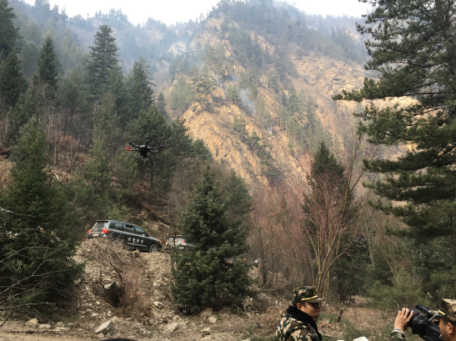 2016年“3•02”甘肃迭部森林火灾现场,科卫泰无人机拍摄火点周围的地形及环境并实时传输到地面指挥中心,引导扑救战士到达着火点实施灭火,或定位着火点坐标后发给直升机,协助直升机进行水箱空投灭火。