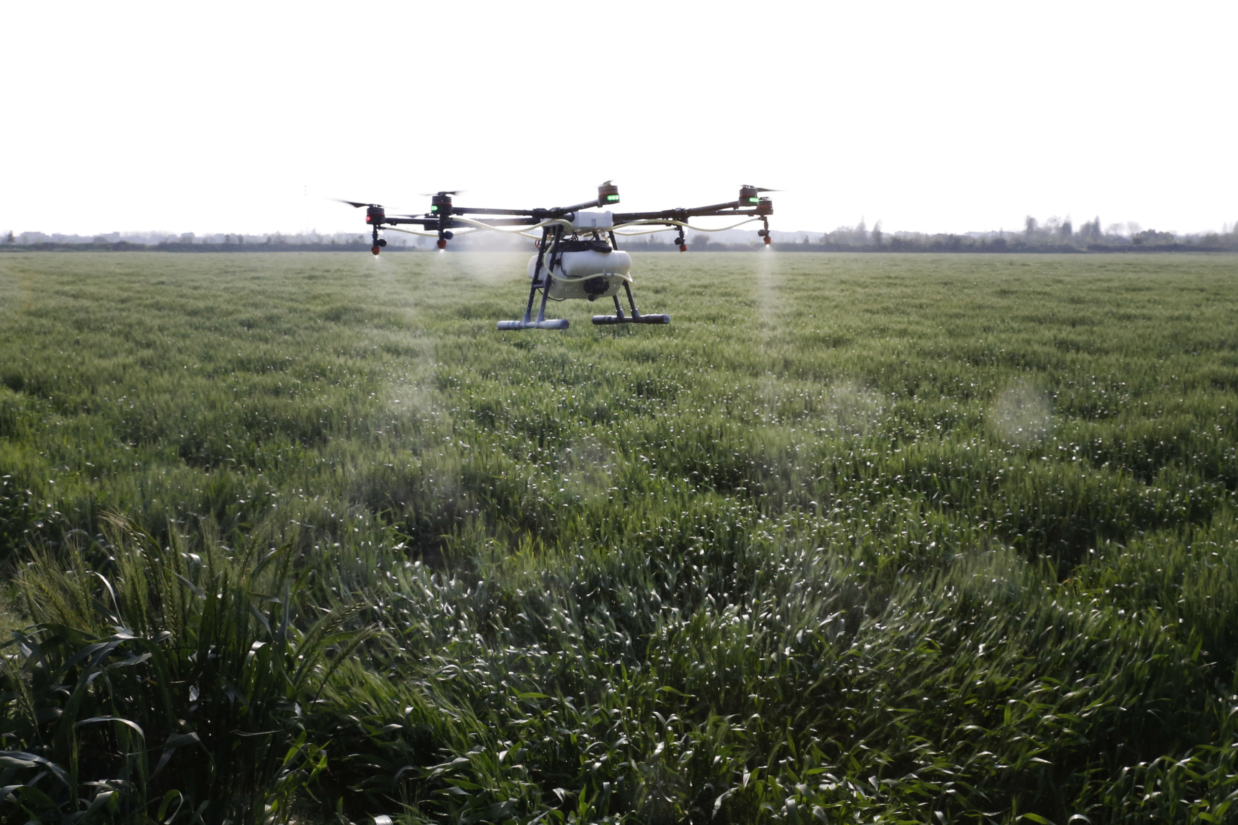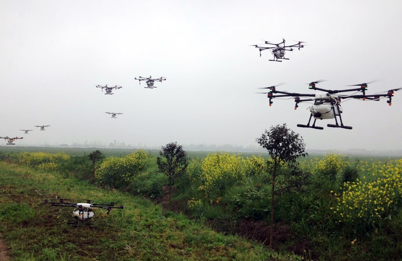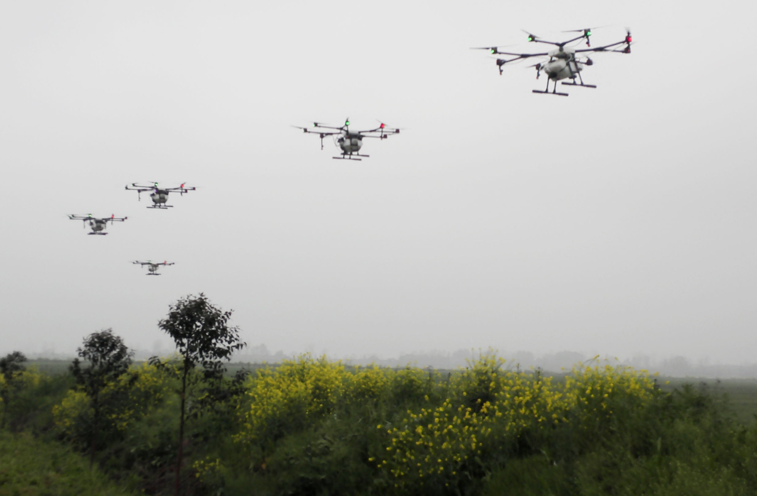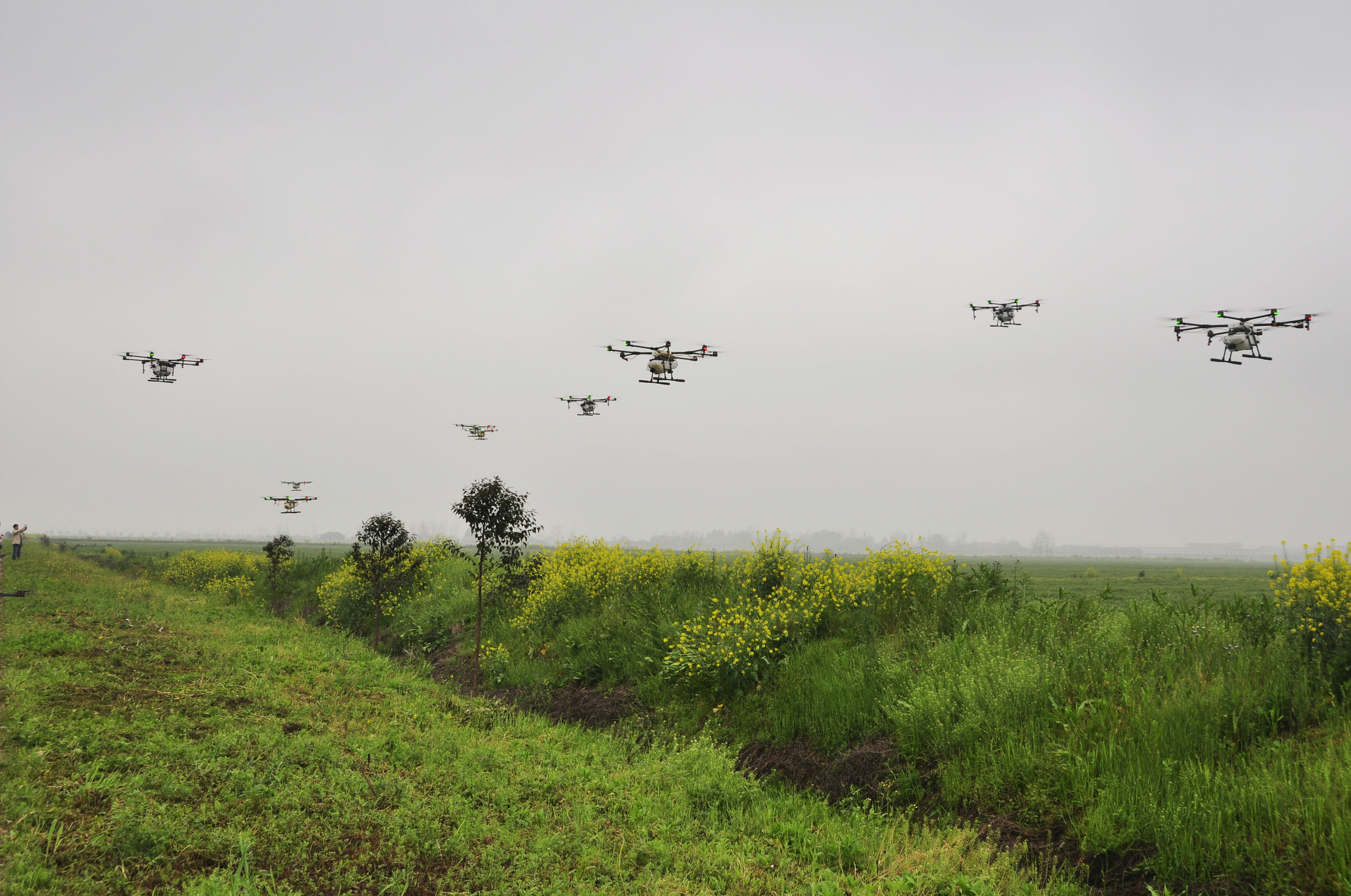 眼下正是小麦赤霉病等重大病虫的防控的最佳时间,安徽省九成畈农场组织30架植保无人机对农场内种植的两万亩小麦进行喷施农药,这也是九成畈农场首次大规模使用植保无人机,标志九成畈农场农作物病虫害防治由传统的人工防治向现代化、专业化统防统治迈上新的台阶。图为无人机战队在列队起飞。