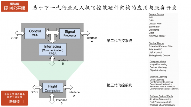而第三代系统,将不再是一个简单的控制器,更多的是可以将其定义为一个飞行的计算机,兼顾控制、计算、接口和通信,将所有计算的部分整合在一起。这么做有很多好处,比如在整个开发难度上只需要一个开发环境、板卡会很小很集成等等。